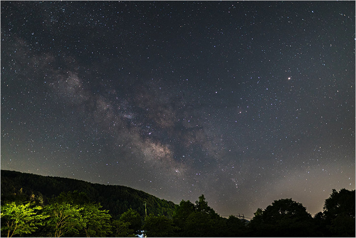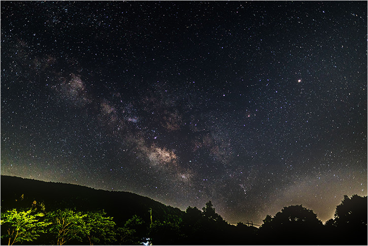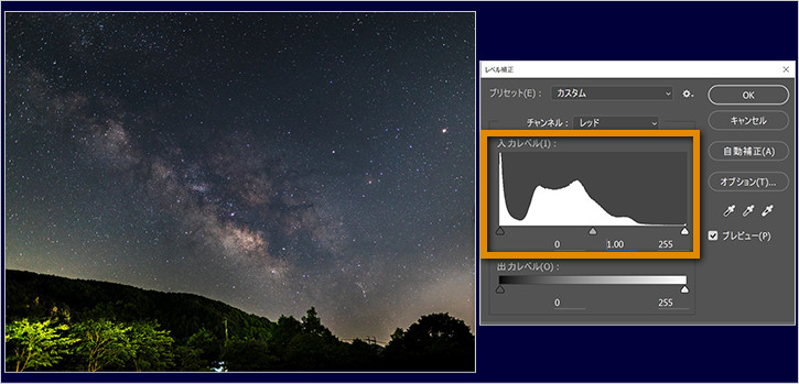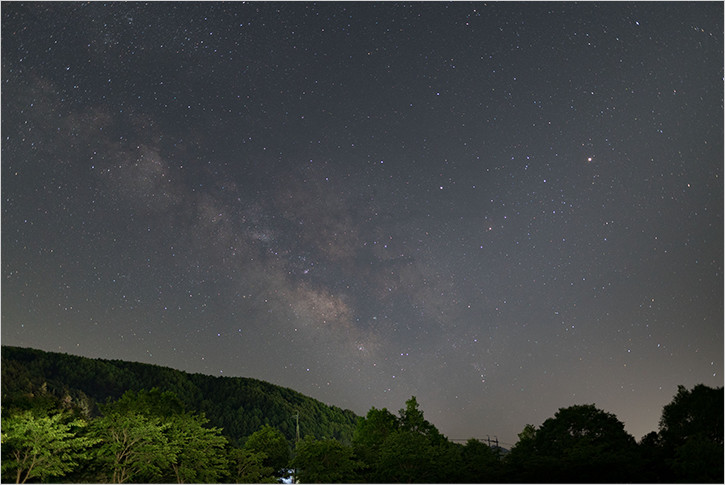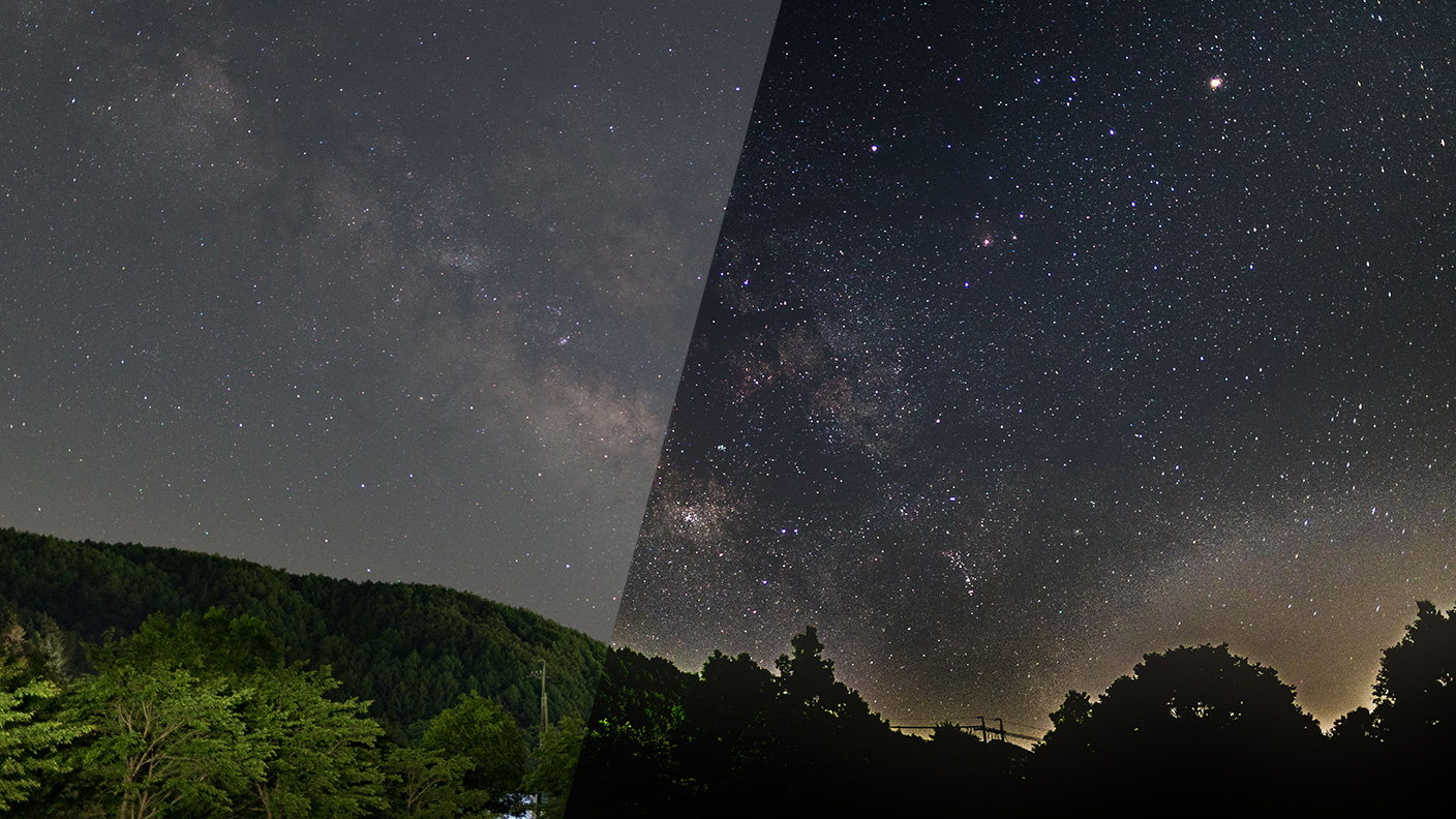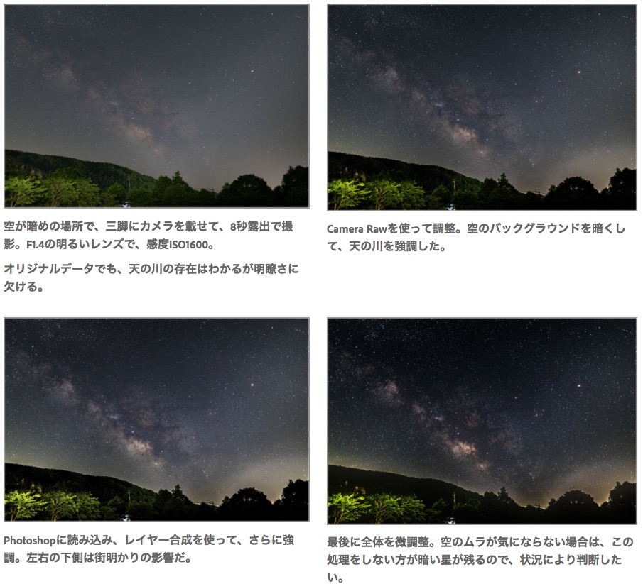 星空の写真は、とにかくどのように写るか、撮ってみないとわからない。そのため、実際には、Photoshopで調整するテクニックなどにも、決まりはない。ここでは、空が暗めの場所で、夏場に撮影した天の川のデータを例に、その基本を紹介したい。このカットは、信州の市街地で撮影したもの。ミラーレスカメラに明るいレンズを装着して、三脚に固定。レンズはF1.4と明るいもので、感度ISO1600で、8秒くらいの露出時間で撮影したRAWデータだ。基本的な工程は3つ。