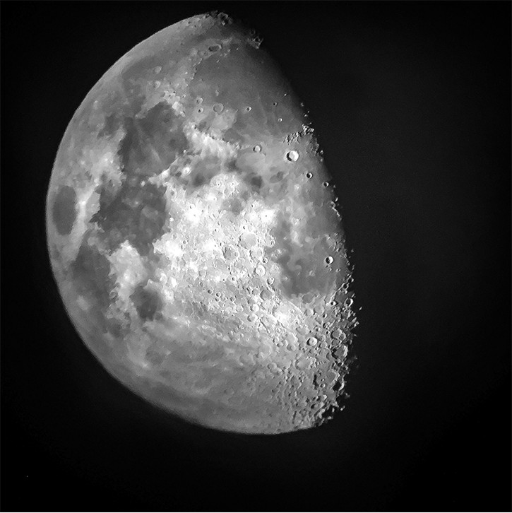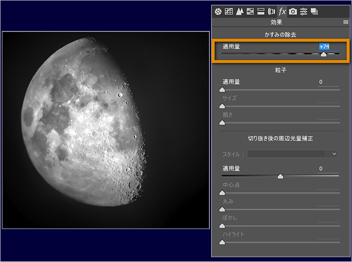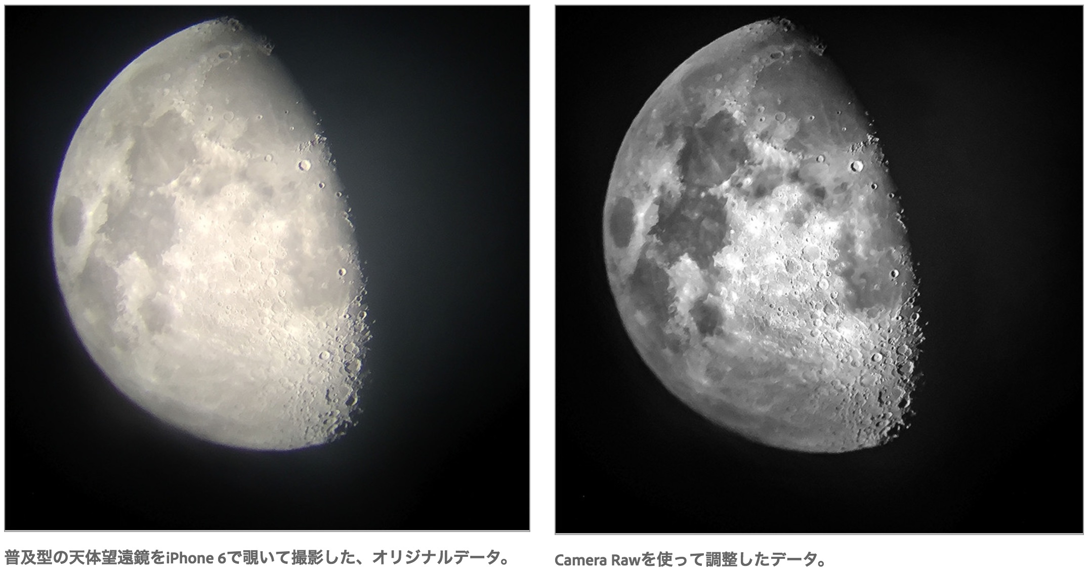 これらを守って撮影すれば、意外に簡単に、月を撮影することができます。しかし、所詮簡易的な撮影方法ですので、あまりクッキリと、シャープな写りになりにくいもの。そこで、Photoshopの出番となるわけです。もちろん、大半のスマートフォンは、JPEGデータでの記録になりますが、それを元に画像を調整しても、思いの外、きれいに仕上がるもの。また、もし、RAWデータで撮れるモデルをお持ちでしたら、RAWデータで撮影したほうが、調整時の自由度が飛躍的に広がるため、よりクォリティーの高いものに仕上がります。