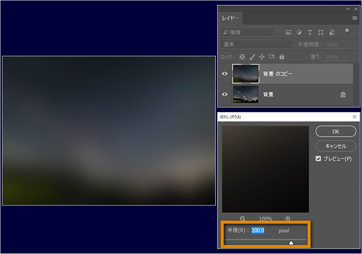 バックの空の明るさにムラがあるので、それを軽減するため、処理したデータのコピーでレイヤーを作成し、そのレイヤーを「 ぼかし(ガウス) 」で200ピクセルぼかす。