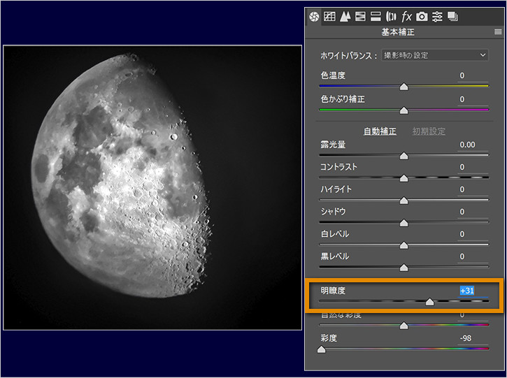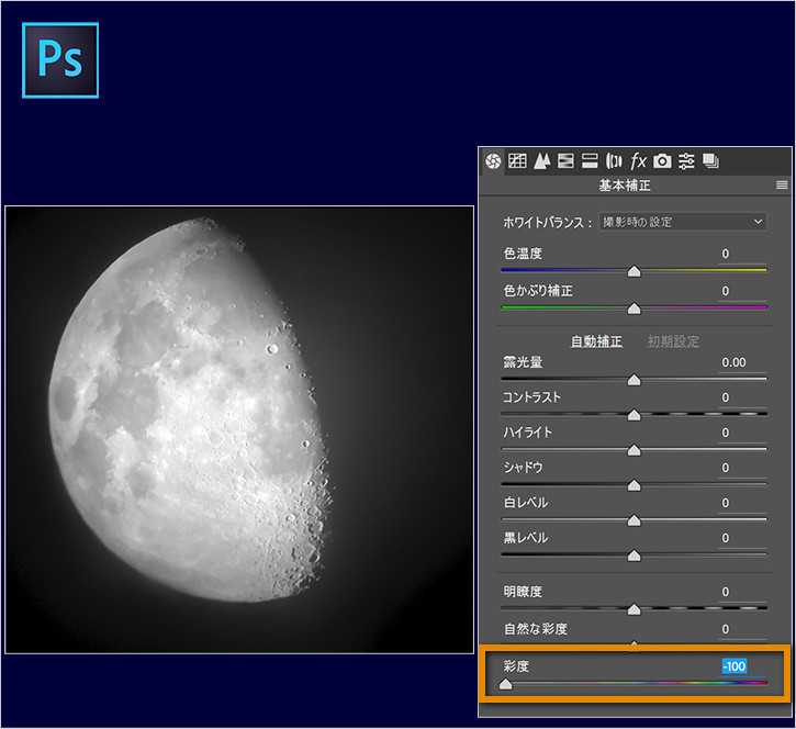 望遠鏡の色にじみなどを軽減するため、「彩度」を-100に設定。彩度のないRGBデータにする。