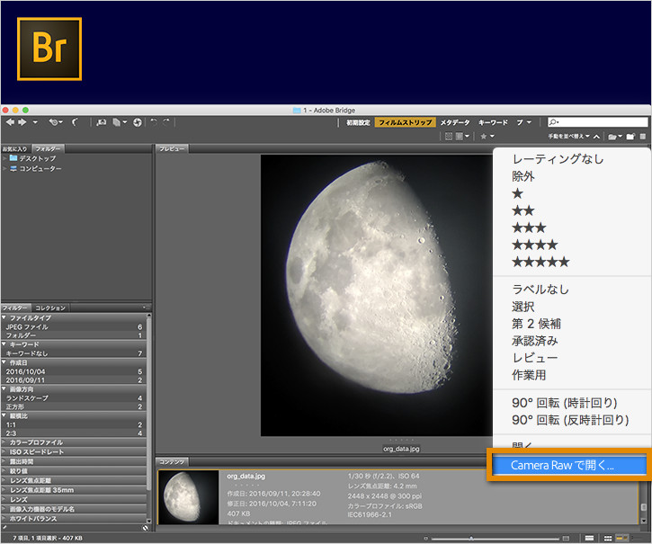 JPEGデータをCamera Rawで調整するため、Bridgeを使って、JPEGデータを開く。