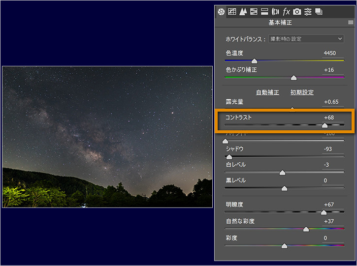 Camera Rawに読み込んで、「 基本補正 」で「 コントラスト 」を高める。