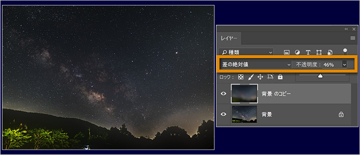 レイヤーの演算を「 差の絶対値 」にし、画像を見ながら不透明度を調整。不自然にならないレベルにするのがポイント。それでも、右下の街明かりは補正しきれなかった。