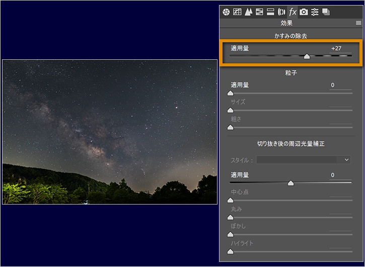 全体にコントラストが低いため、「 かすみの除去 」機能を使って、メリハリをつける。