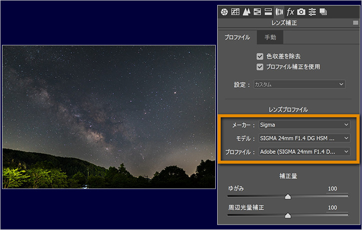 「 レンズ補正 」メニューで、使用レンズの補正プロファイルを読み込み、周辺光量補正などを施す。