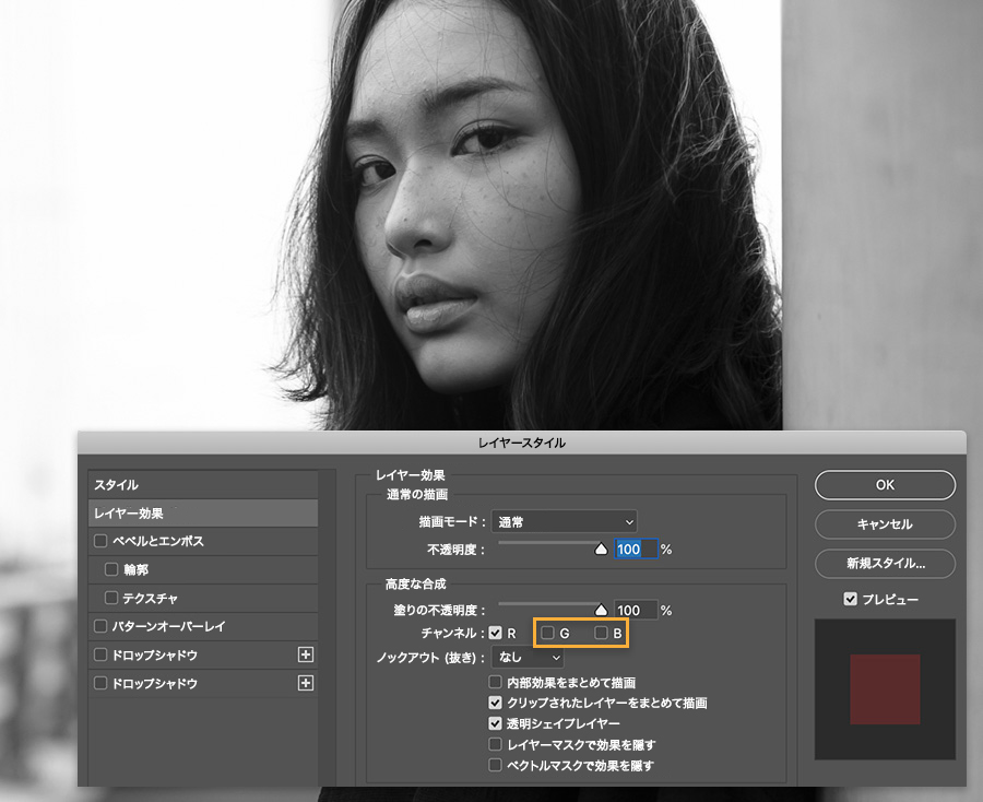 新しいレイヤーをダブルクリックして、レイヤースタイルダイアログでグリーンとブルーのチャンネルをオフにします。