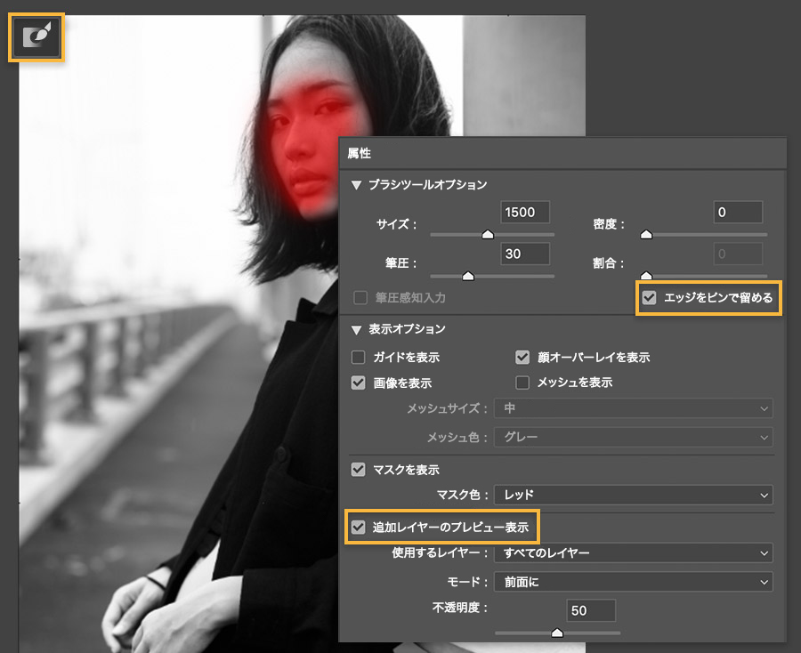 属性パネルで「エッジをピンで留める」をオンにします。これにより、ワープブラシを使用したときに画像の端が巻き込まれすぎるのを防ぐことができます。最後に「追加レイヤーのプレビュー表示」をクリックして、加えた変更を適用する前にプレビューできるようにします。