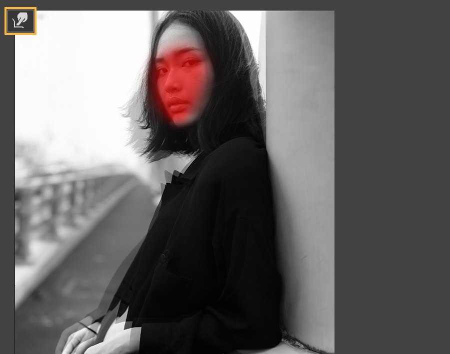 画像を変形するための準備をします。ゆがみフィルター(フィルター/ゆがみ)を選択して、マスクツールでモデルの顔をなぞります。これにより、写真にゆがみを加えたときに顔の部分が除外されるようになります。