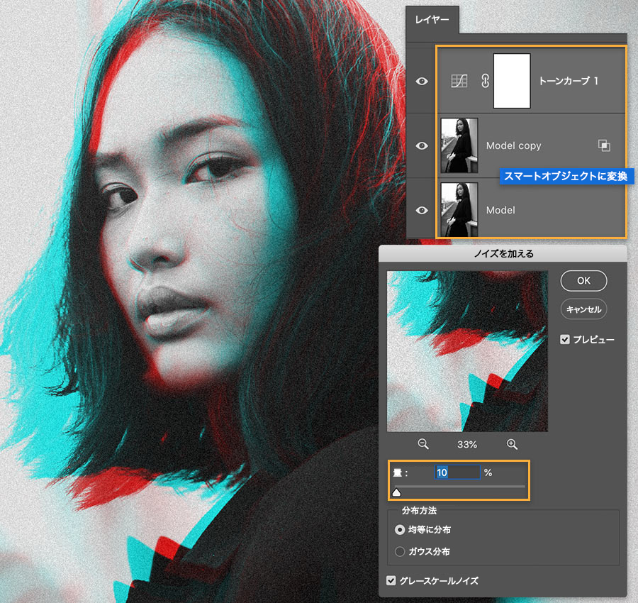 効果をなじませるために粒子を追加してから、Shiftキーを押しながらクリックしてすべてのレイヤーを選択し、右クリックして「スマートオブジェクトに変換」を選択します。フィルター/ノイズ/ノイズを加えるを選択し、「量」を調整して「グレースケールノイズ」をオンにします。