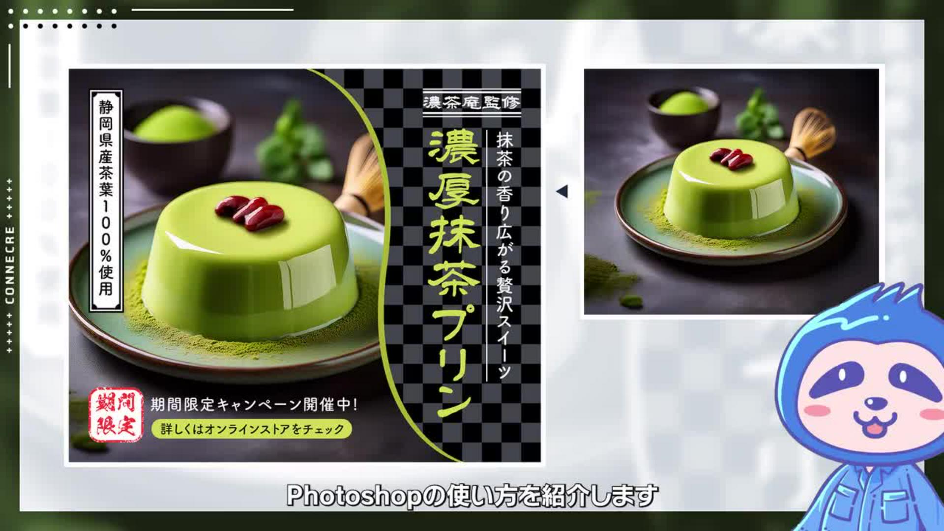 抹茶プリンのバナー制作を通し、「市松模様のパターン作成」「マスクを使った画像の切り抜き」「縦書き文字」「印鑑のようなかすれ加工」について学びます。