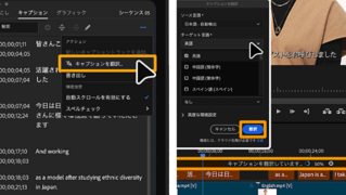 テキストパネル内の「キャプションを翻訳」アイコンを選択し、対応言語のリストから選択します。新しいキャプショントラックがタイムラインに追加されます。