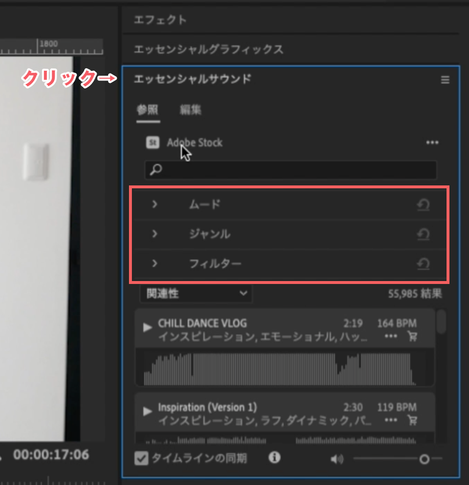 まずは、エッセンシャルサウンドを選択します。Adobe StockからBGMを選択できますが、まずは「ムード・ジャンル・フィルター」で自分が表現したい雰囲気に合う要素をチェックしていきましょう。