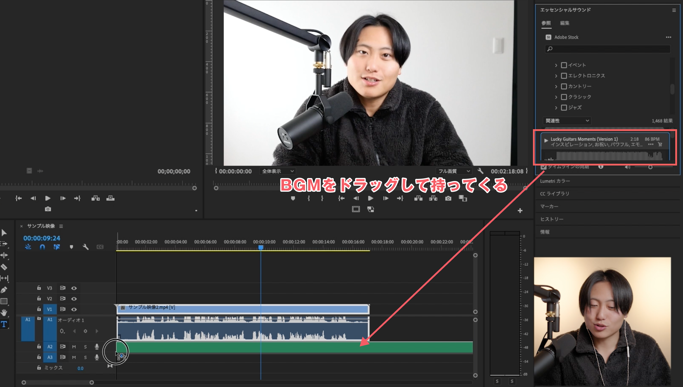 BGMの編集をしていきましょう。今回は自分の手で手探りをしながら編集していくマニュアル編と、Premiere Proに編集の大半を任せるエッセンシャルサウンド編を学びます。