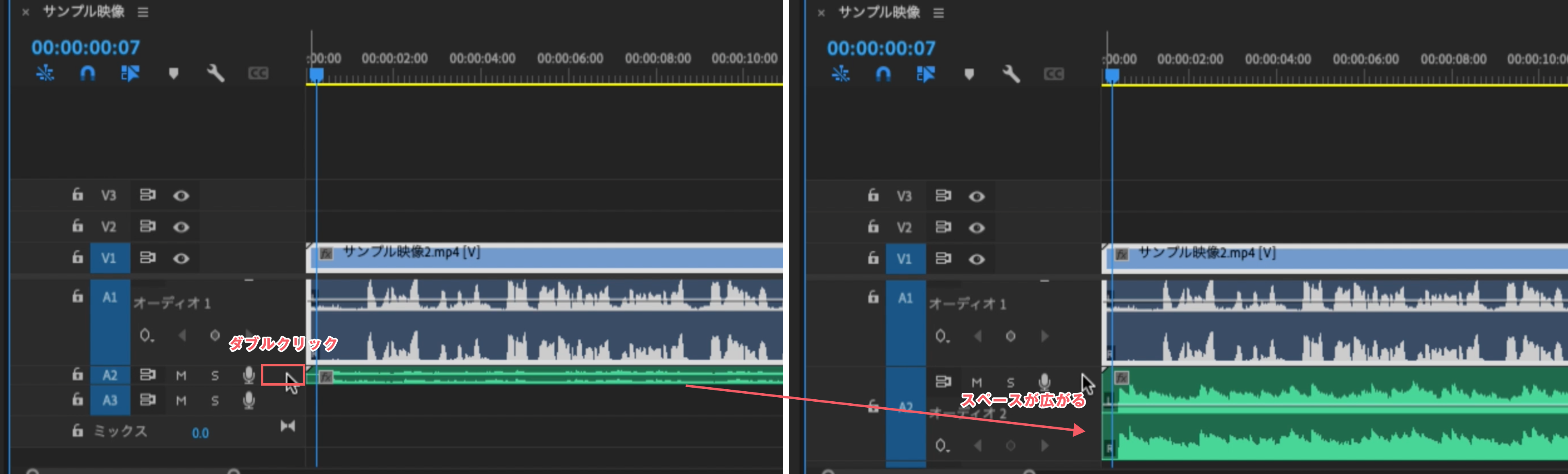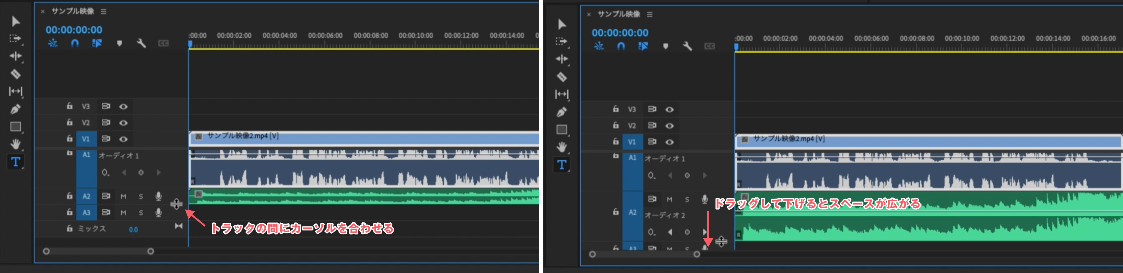 こうすることで、オーディオトラックのスペースが広がりました。また、オーディオトラックのスペースを広げるもう一つの方法として、オーディオトラックの空白箇所をダブルクリックすることでも、同様に選択したオーディオトラックを広げることができます。