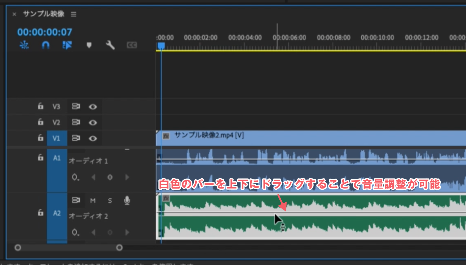 さて、オーディオトラックの幅を広げると、白色のバーが出てきます。これを上下にドラッグすることで音量を調整することができます。