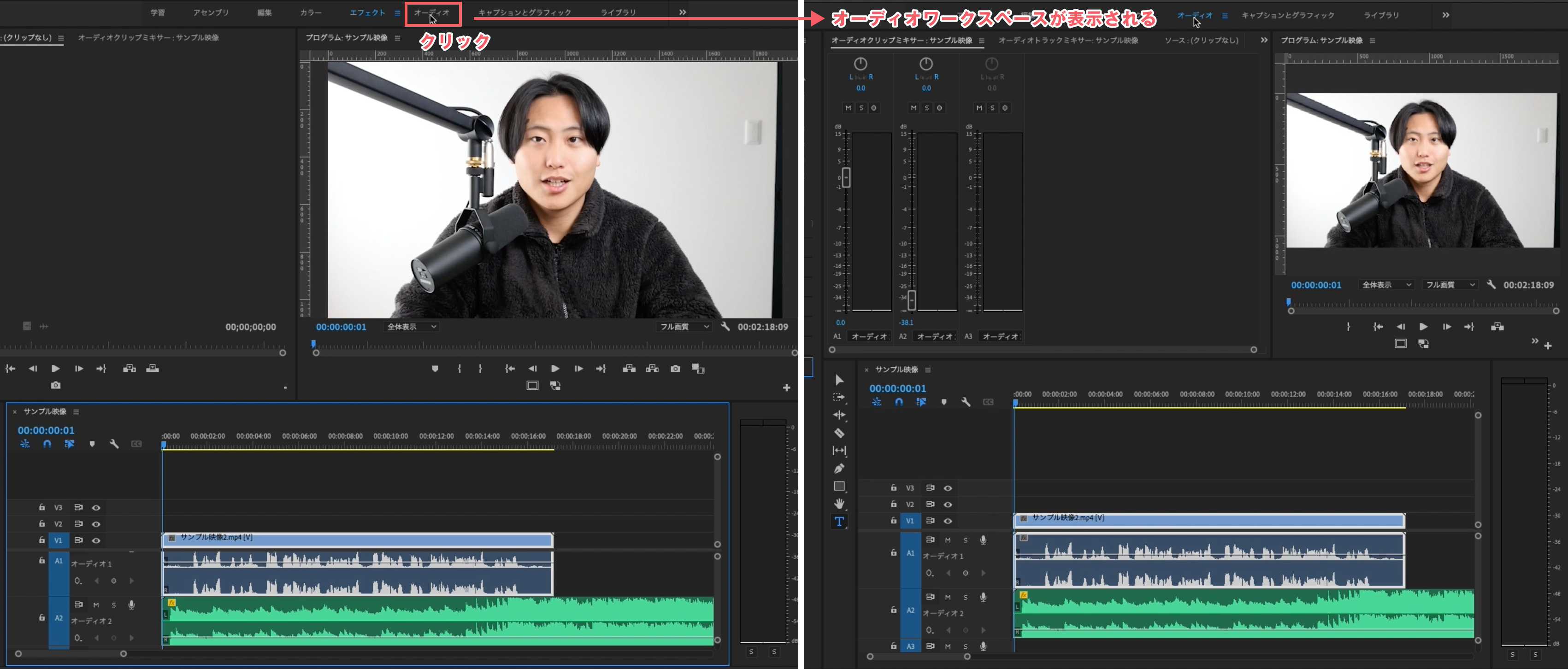 上記の他に、もう少し細かくオーディオの音量を調整する方法もあります。まずはワークスペースを「オーディオ」にしましょう。