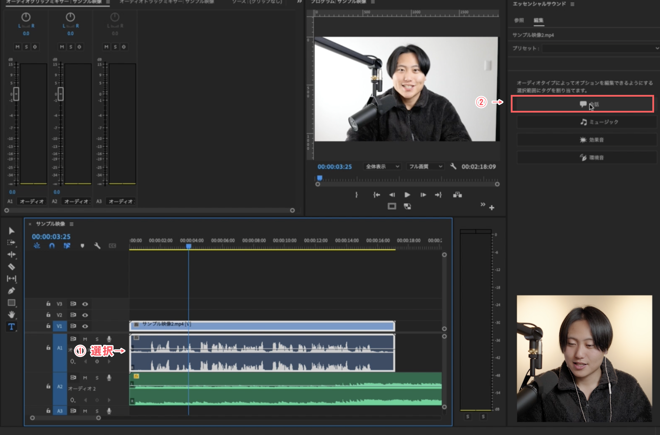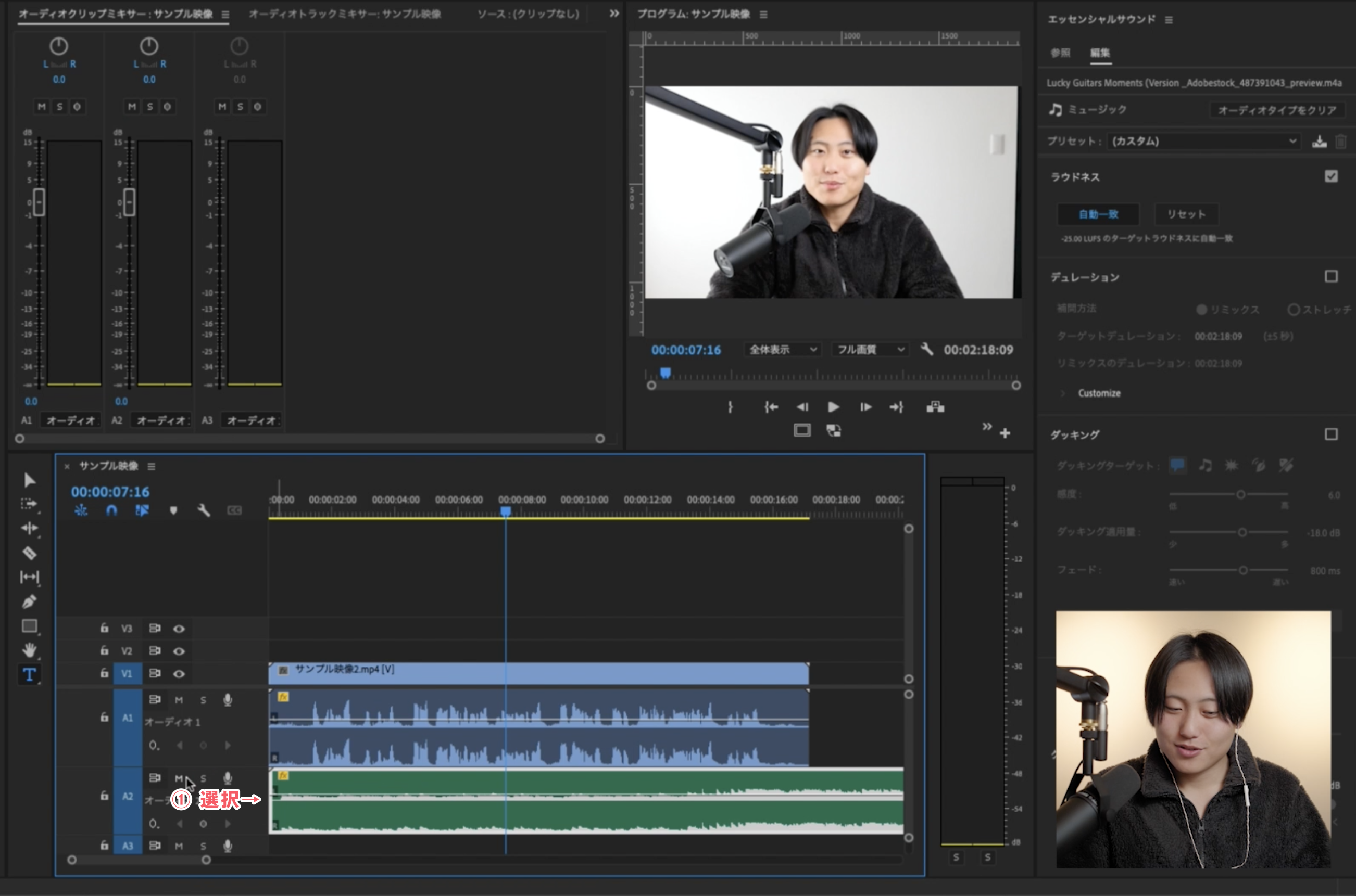 続いて、Premiere Proに編集の大半を任せてしまうエッセンシャルサウンドを用いた音量調整方法です。