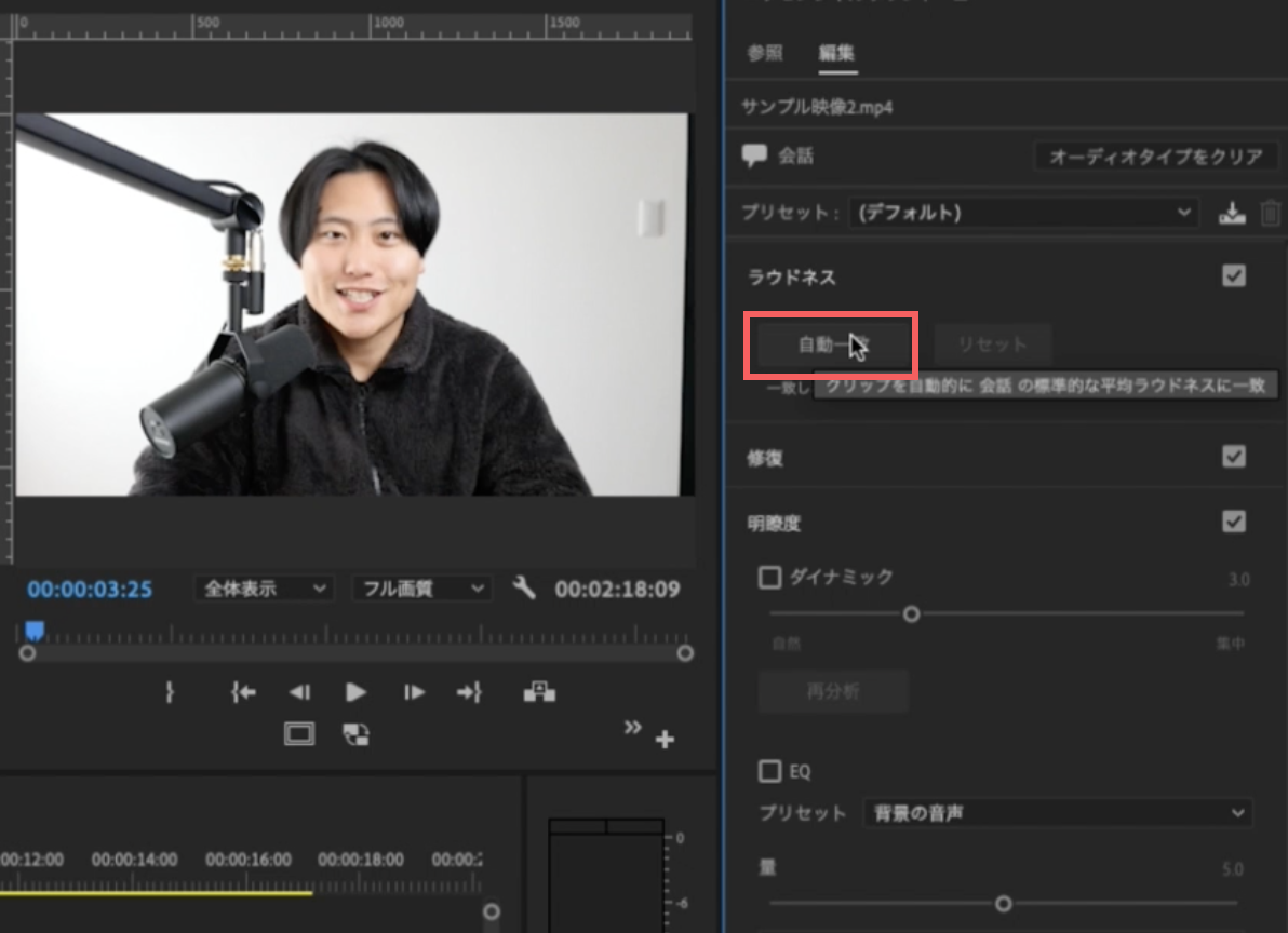続いて、同様に話し声の音量も調整していきます。オーディオトラック1の音声を選択して、エッセンシャルサウンドの編集から「会話」を選択しましょう。