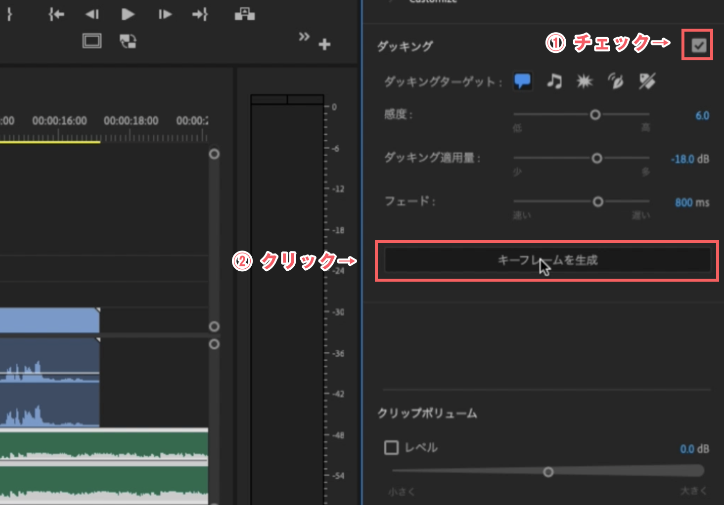 ダッキングという項目がありますので、こちらで「キーフレームを生成」をクリックします。