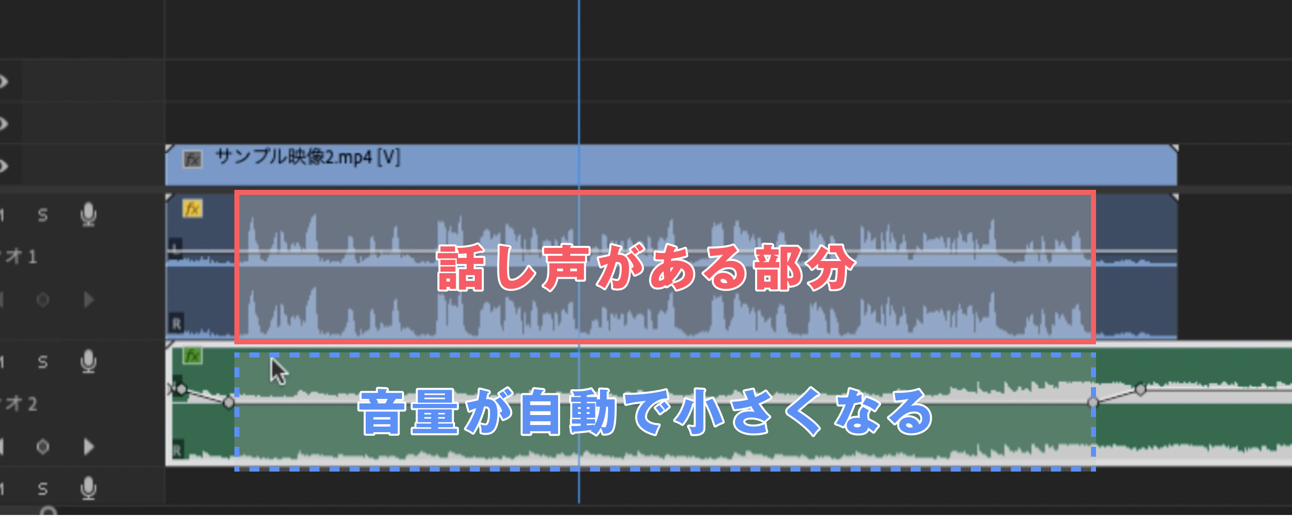 今まではBGMと話し声の音量を調整してきました。しかし、BGMについては注意が必要になります。先ほどの音量調整は、あくまでBGMが単体の時のための最適な音量ということで、BGMと話し声両方が重なっている時には若干BGMの音量が大きく聞こえてしまいます。その対処として「オートダッキング」があります。