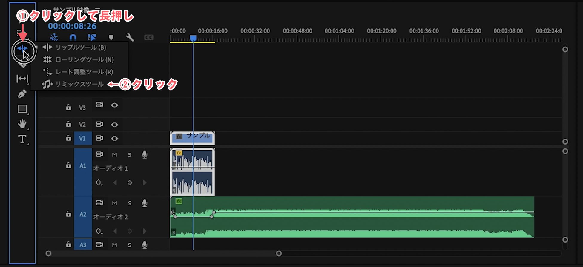 ツールバーの上から3つ目にあるリップルツールをクリックしたまま長押しします。すると、4つのツールが新たに表示されますので、ここで「リミックスツール」を選択しましょう。