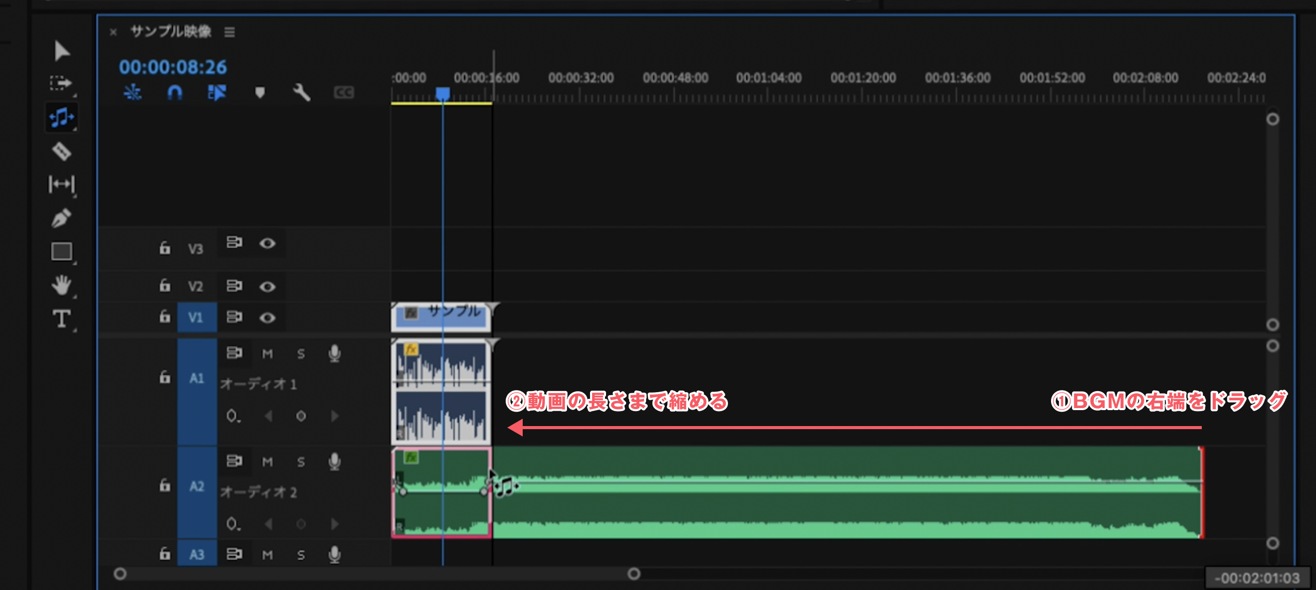リミックスツールを選択できたら、BGMの右端をドラッグし、動画の長さと同じになるようにそのまま縮めていきます。