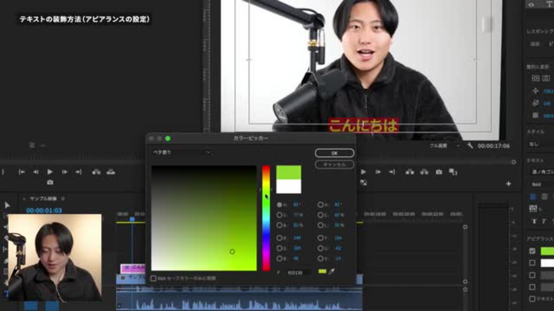 日本のYouTuberのように、目立つ大きなテロップを作ってみましょう。ポイントはフォントは太めのゴシックを使い、テキストのサイズは大きめにして、境界線を使ってテキストの縁取りを大胆にすることです。