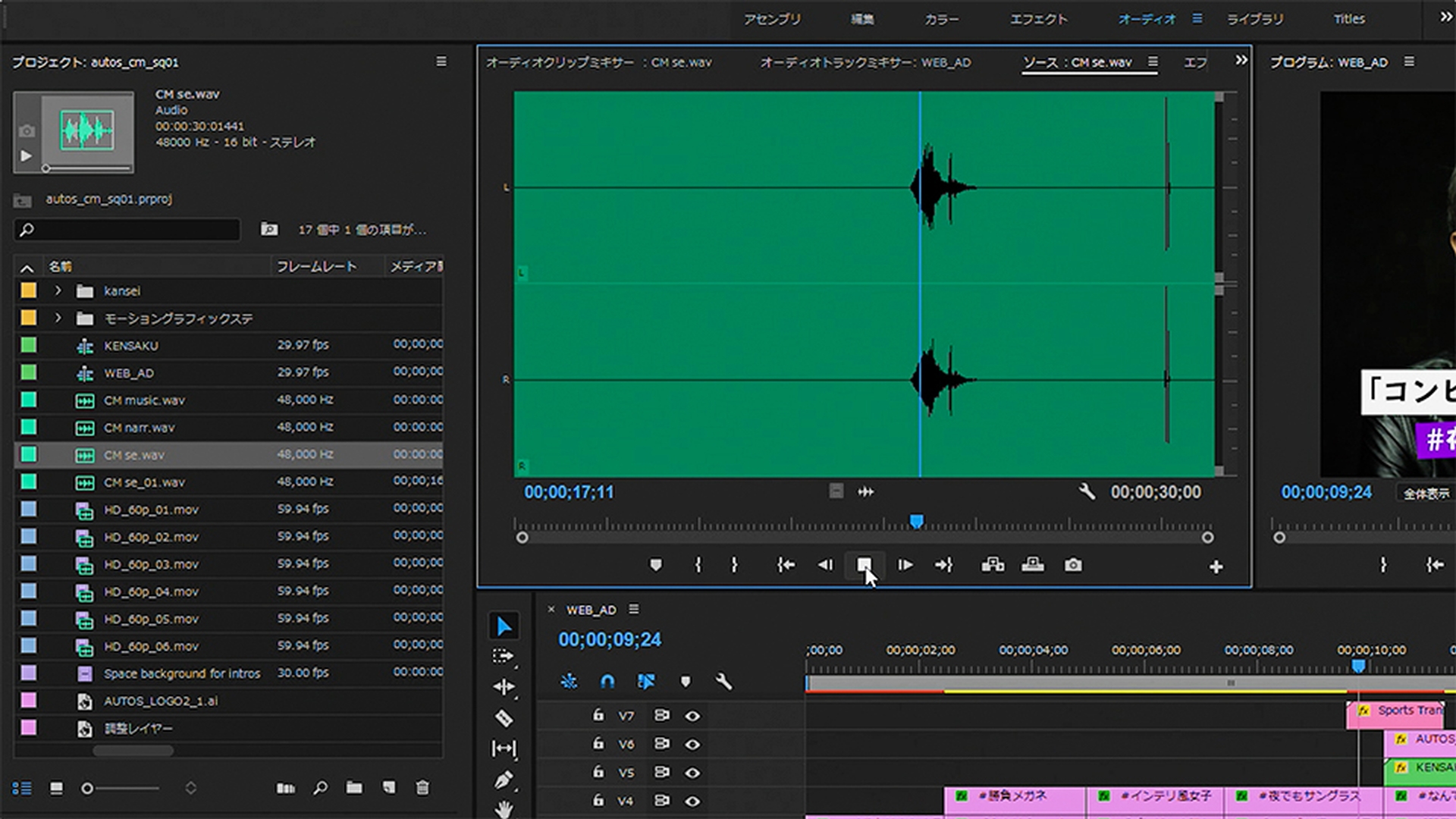 完成まであともう少し。最後は、映像に音楽や効果音(SE)、ナレーションを入れていきます。用意してあるオーディオファイルをPremiere Proに読み込み、シーケンスに配置して長さやタイミング、ボリュームなどを調整しながら、映像にマッチした「音」の演出を行います。