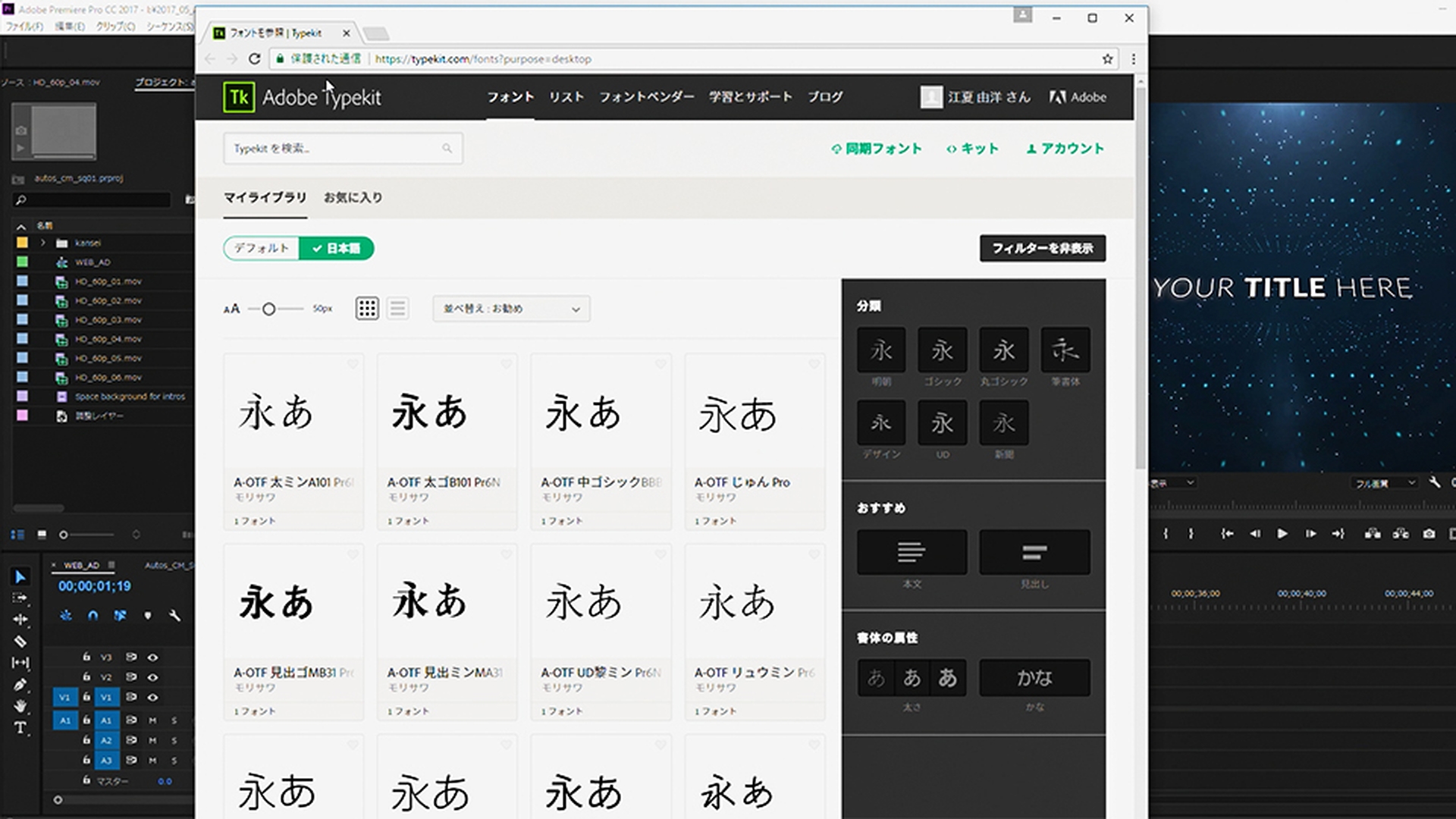ここからは、動画に文字の要素を入れていきます。まずタイトルは、アニメーションやエフェクトが適用されたプリセットを使用し、テキストをカスタマイズします。フォントは、Typekitの豊富なフォントライブラリから広告のイメージに合ったものを選びます。