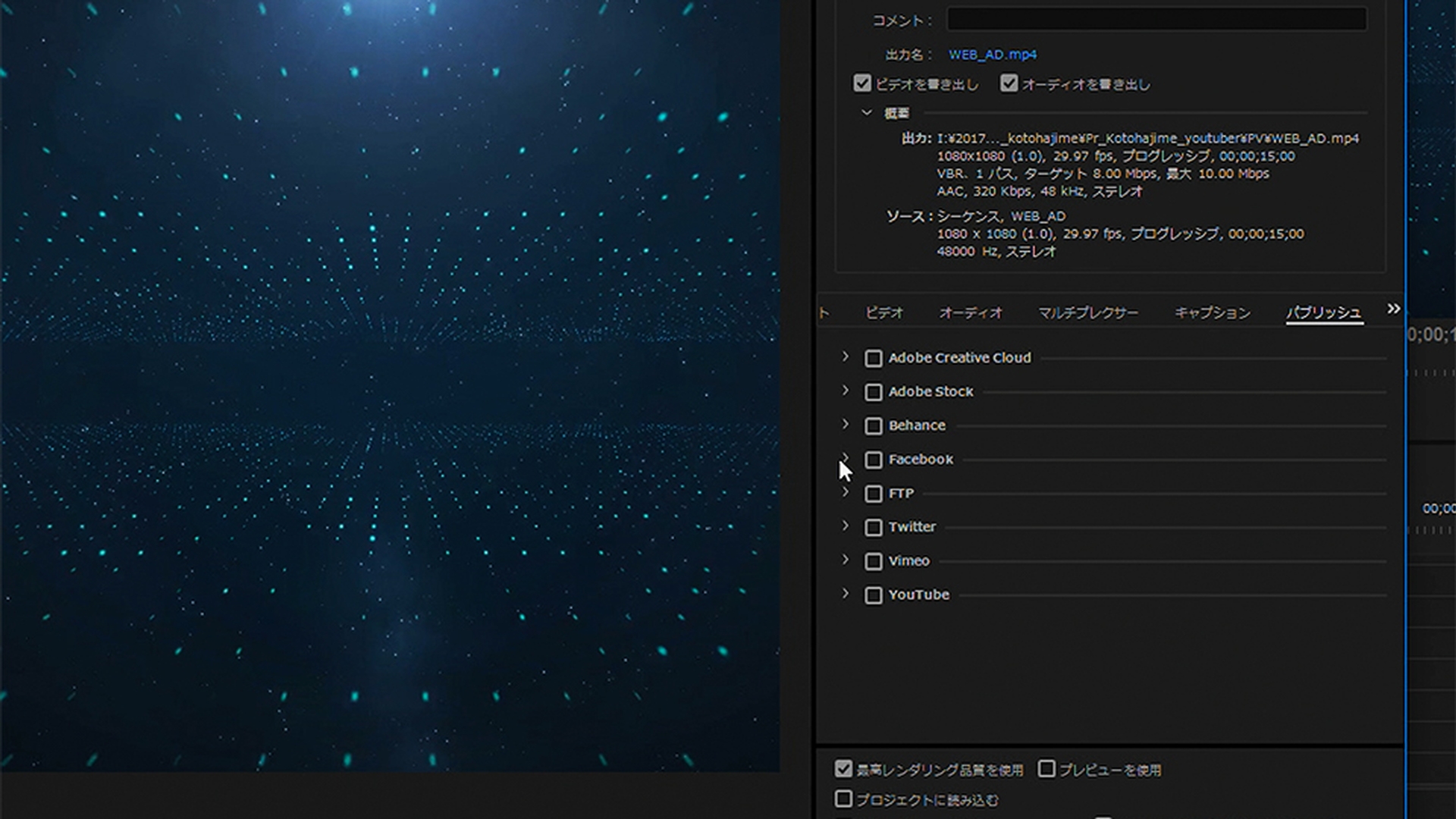完成した作品をWeb広告用に書き出します。ここでは、書き出し設定の注意点を説明するとともに、便利な「パブリッシュ」機能を使った書き出し方法をご紹介します。この機能により、FacebookやTwitter、YouTubeなどに動画を自動でアップロードすることができます。