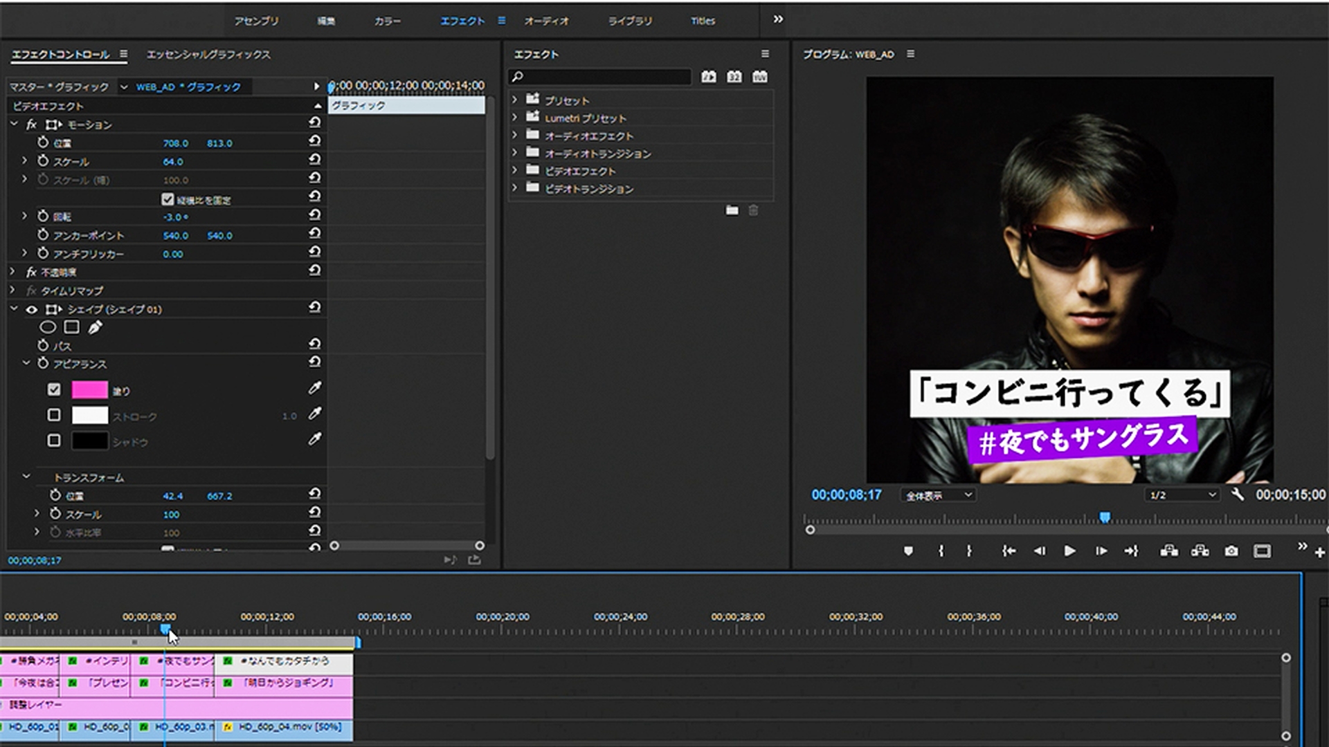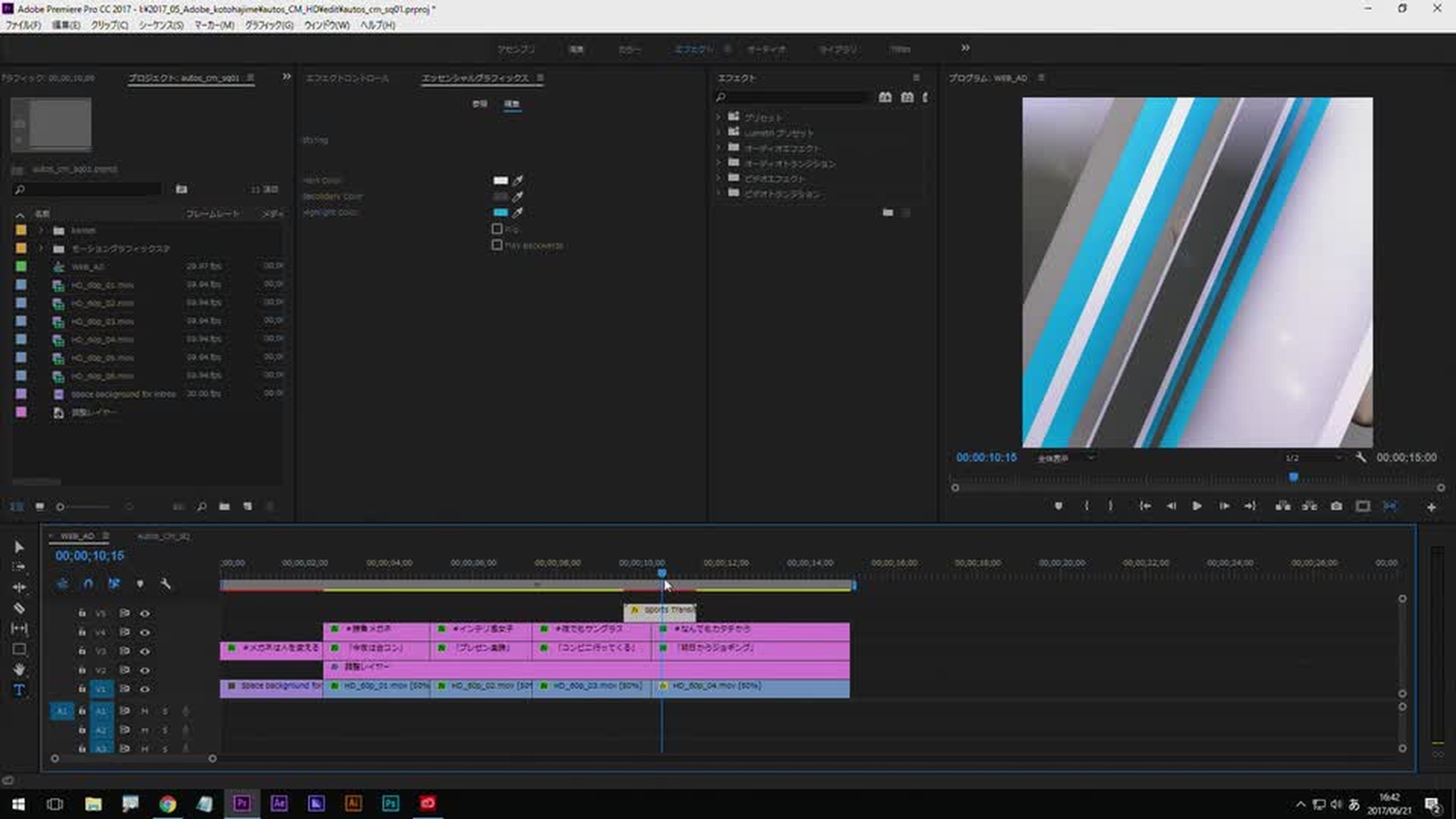 さらに効果的なグラフィックを追加してみます。エッセンシャルグラフィックスには、トランジション効果のあるグラフィックのプリセットが多数用意されており、シーケンスにドラッグ&ドロップするだけで簡単に追加できます。