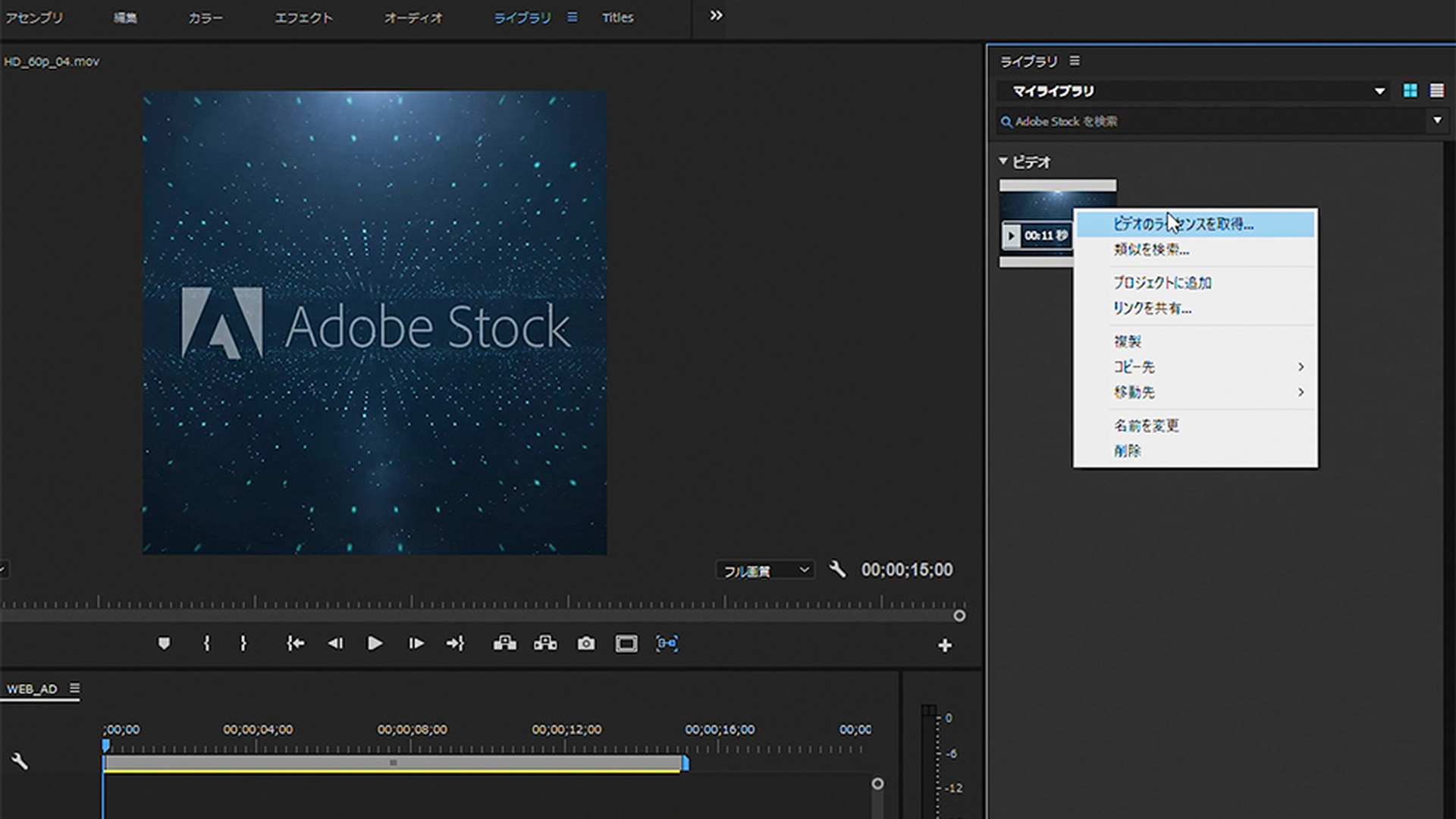 動画の出だしにインパクトのある映像を差し込みたいので、ここではAdobe Stockのビデオ素材を使ってみます。Premiere Proのライブラリパネルで直接Adobe Stockの素材を検索し、シーケンスに追加して、ライセンスを購入するまでの手順を説明します。