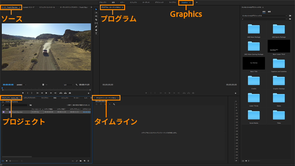 Premiere Proを起動し、「新規プロジェクト」ダイアログボックスでプロジェクト名と保存先を指定し、「OK」をクリックします。次に、画面上部のワークスペースバーにある「Graphics」をクリック、または「ウインドウ」→「ワークスペース」→「グラフィック」を選択します。