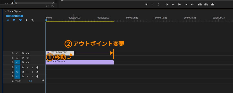 画面上部のワークスペースバーにある「編集」をクリックします。「タイムライン」パネルのV2トラックにあるグラフィッククリップ「2017 ROAD TRIP」を、1つ上のV3トラックにドラッグして移動します。続いて、クリップの右端にカーソルをのせ、カーソルの表示が右向きの赤い矢印に変わったら、「Option」キーを押しながら、下にある「Truck Clip.mov」と同じ長さになるまで右方向にドラックします。