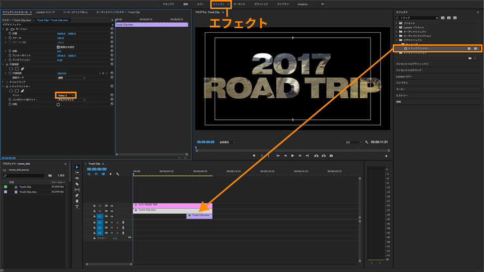画面上部のワークスペースバーにある「エフェクト」をクリックし、ワークスペースを切り替えます。次に、「エフェクト」パネルを表示させ、検索フィールドに「トラック」と入力します。「ビデオエフェクト」→「キーイング」→「トラックマットキー」が表示されるので、それをドラッグしてV2トラックの「Truck Clip.mov」にドロップします。