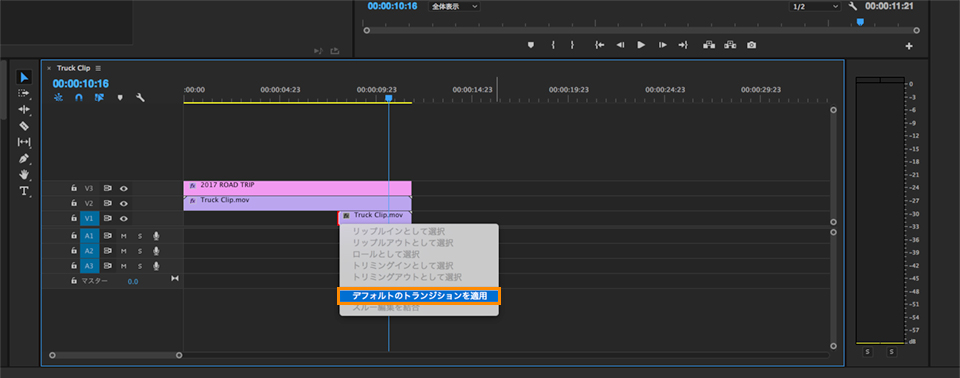 最後に、V1トラックの「Truck Clip.mov」のクリップの左端にカーソルをのせ、カーソルの表示が右向きの赤い矢印に変わったら、右クリック(Windows)または「Control」キーを押しながらクリック(Mac)し、メニューから「デフォルトのトランジションを適用」を選択します。
