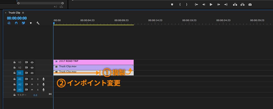今度は、 V1トラックのビデオクリップ「Truck Clip.mov」を選択し、「Option」キーを押しながら、1つ上のV2トラックにドラッグします。V2トラックに「Truck Clip.mov」が複製されました。続いて、V1トラックの「Truck Clip.mov」の左端にカーソルをのせ、表示が右向きの赤い矢印に変わったら、インポイントが「00:00:08:00」になるまで右方向にドラッグします。クリップがトリミングされました。