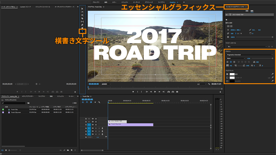 エッセンシャルグラフィックパネル、文字ツール、クリップのトリミング、トラックマットキーエフェクト