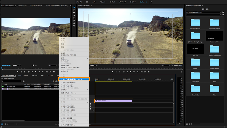 「プロジェクト」パネルの「Truck Clip.mov」を右クリック(Windows)または「Control」キーを押しながらクリック(Mac)し、メニューから「クリップに最適な新規シーケンス」を選択します。「タイムライン」パネルにシーケンスが作成されました。「プログラム」パネルには、シーケンスの映像が表示されます。