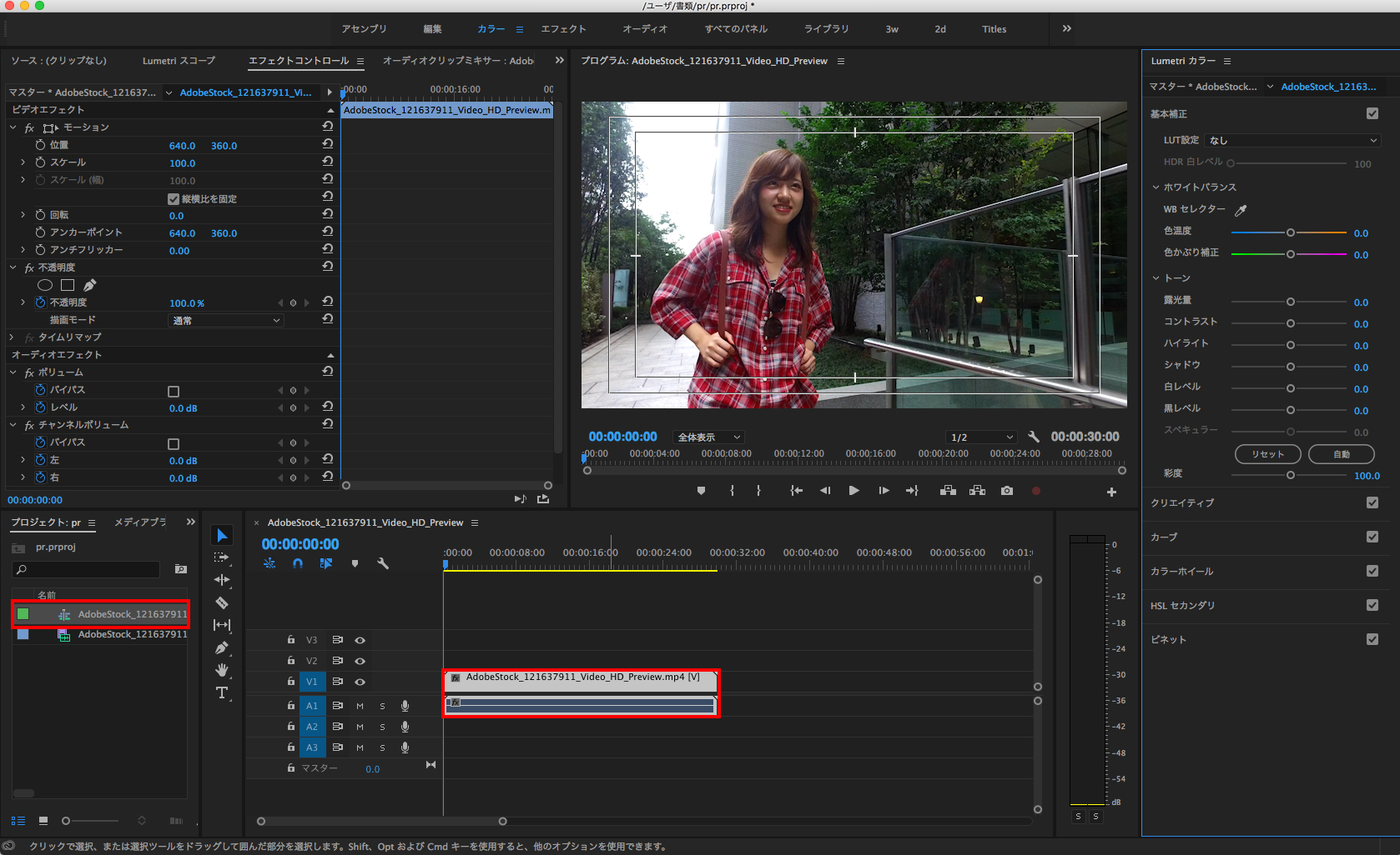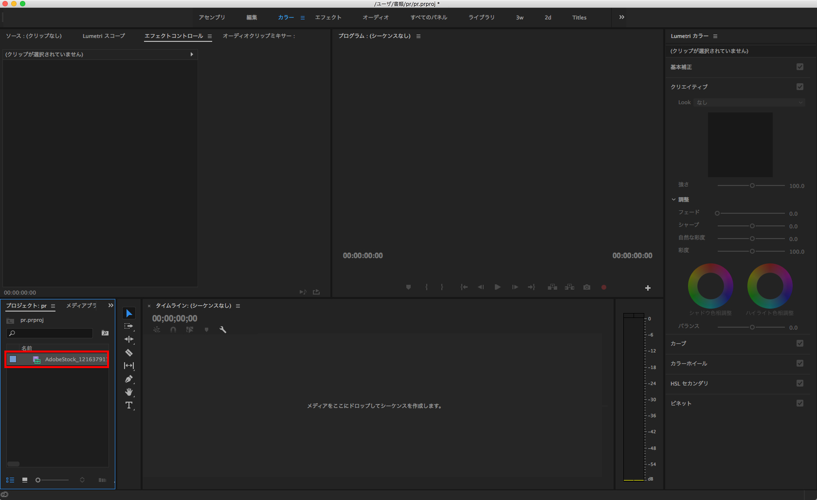 読み込んだ映像ファイルをカットしたり、色を変えたりといった編集を行う場となるシーケンスを作成します。[プロジェクト]パネルから読み込んだ素材を [タイムライン] パネルにドラッグ&ドロップすると、自動的に最適な設定のシーケンスが作成されます。