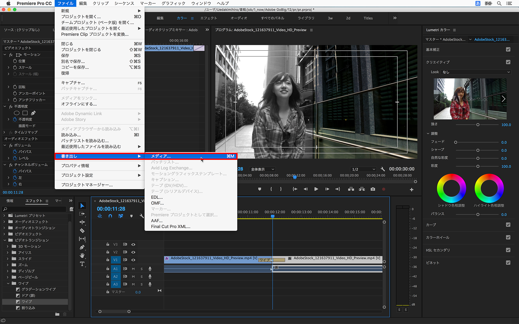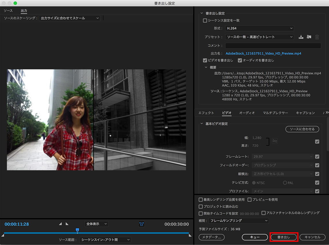 動画を書き出します。[ファイル] → [書き出し] → [メディア...]を選択し、[書き出し設定]パネルの[書き出し]をクリックして動画ファイルを保存します。