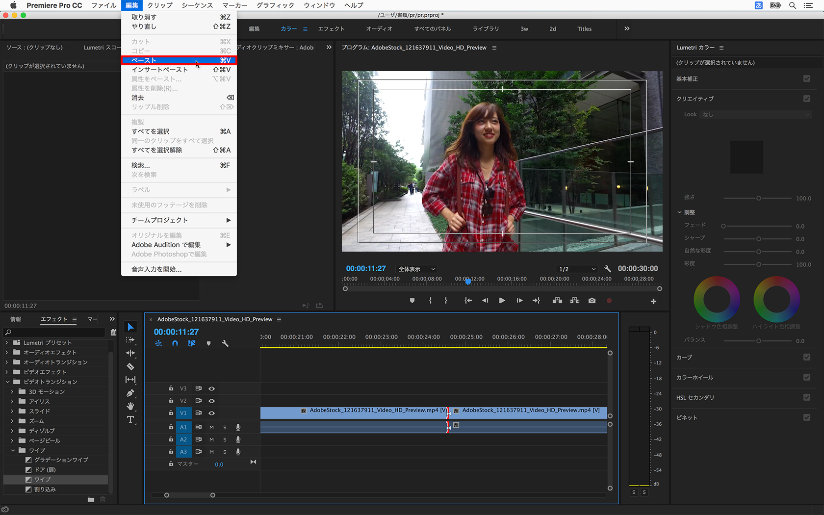 複数のクリップの境目に同じ設定のワイプを適用したい場合は、タイムライン上でワイプをコピー・アンド・ペーストします。