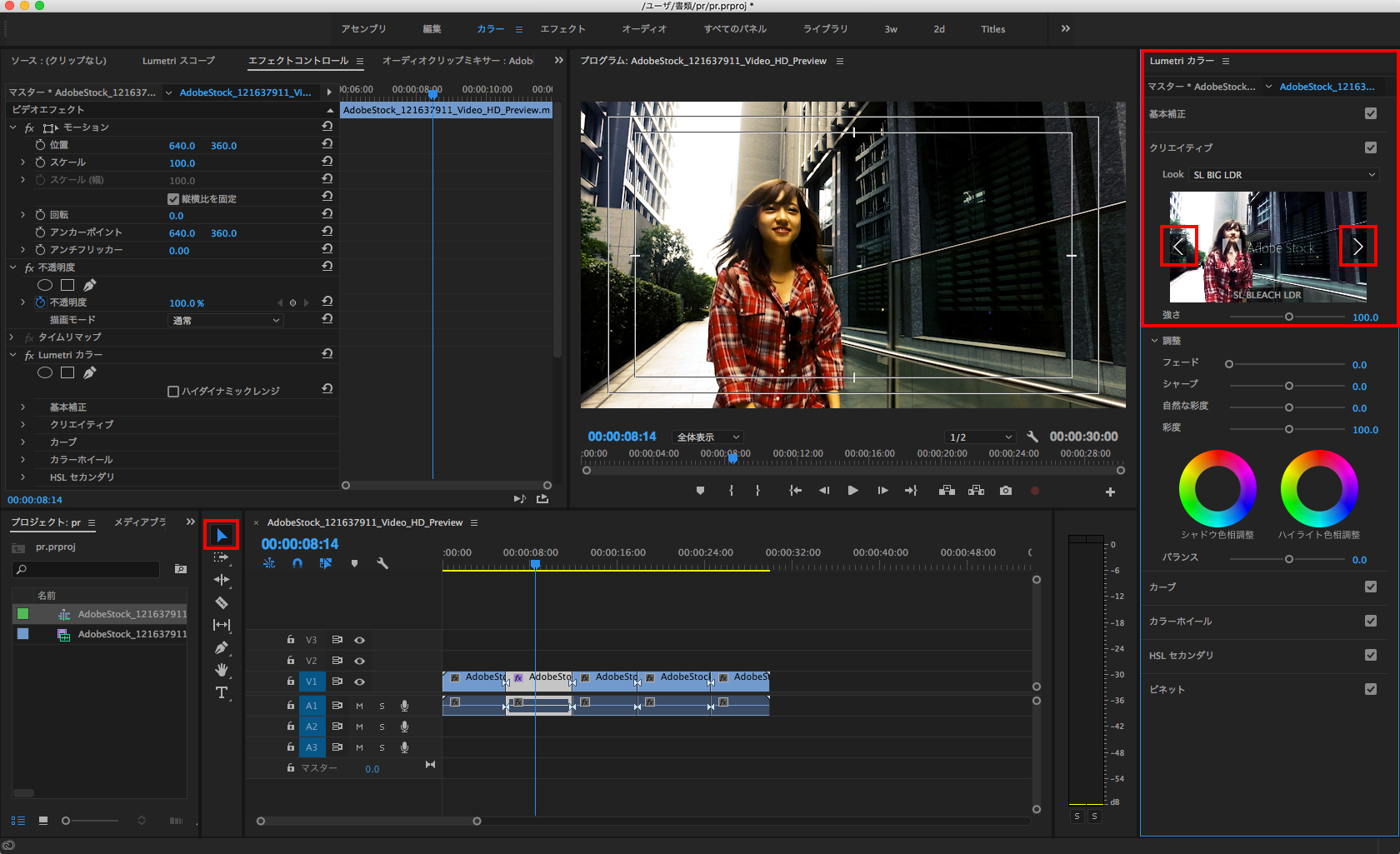ツールパネルから[選択ツール]を選択し、色合いを調整したいクリップを選択し、[Lumetriカラーパネル] → [クリエイティブ]を選択。 [Look] プルダウンか、サムネールの左右にある矢印をクリックして、好みの色合いが見つかったらサムネールをクリックして適用します。