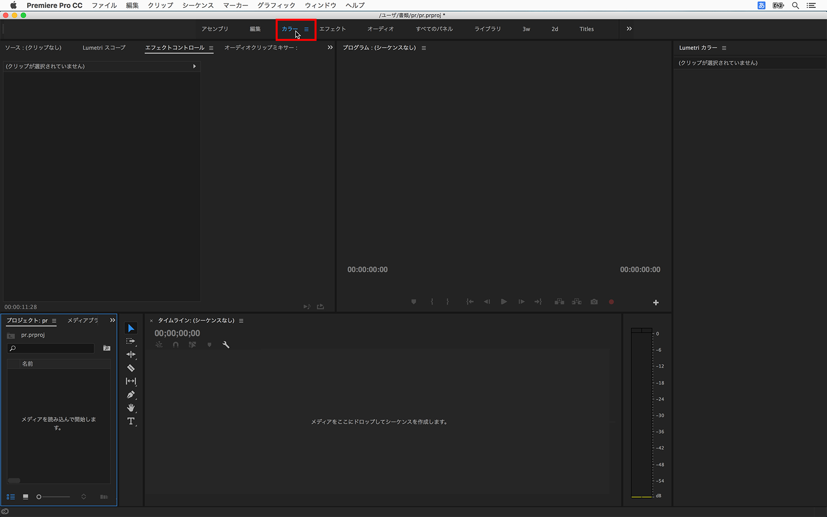 画面上部の[カラー]をクリックし、色合いの調整に適したワークスペースに変更します。