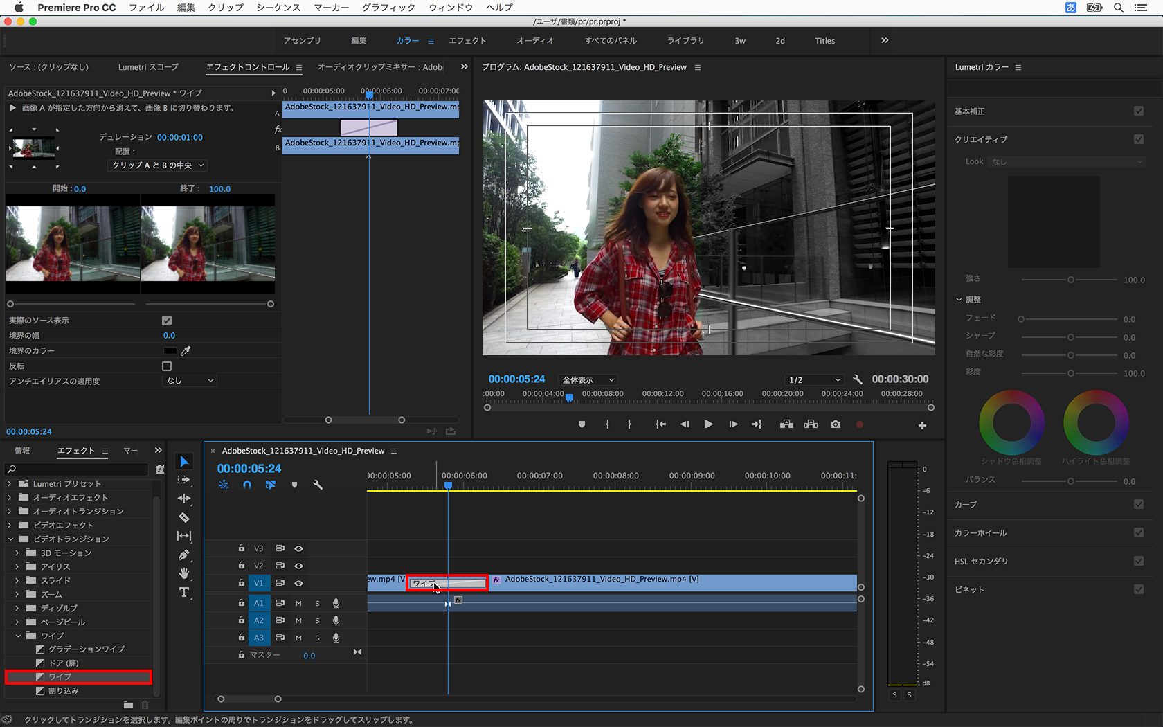 [ウィンドウ] → [エフェクト]を選択してエフェクトパネルを表示し[ビデオトランジション] → [ワイプ] → [ワイプ]を表示します。[ワイプ]をタイムライン上のクリップとクリップの境目にドラッグ&ドロップして適用します。