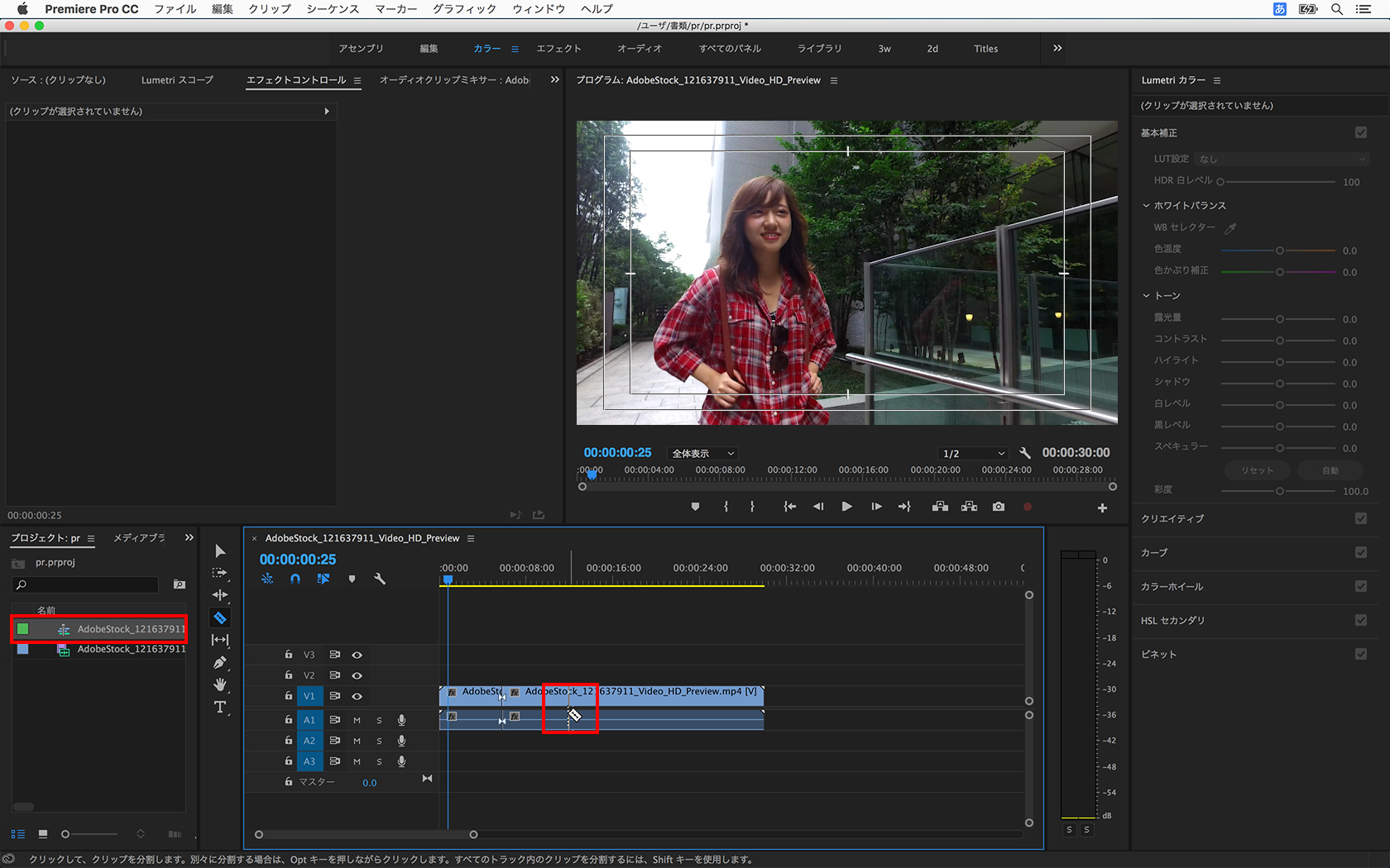 クリップ全体の色合いを調整したい場合は分割する必要はありません。