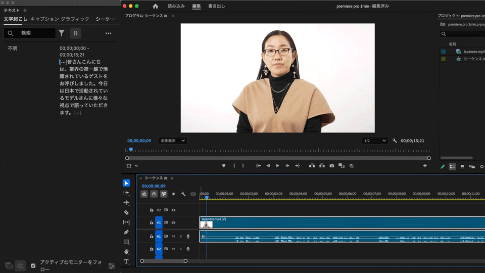 「編集」ワークスペースに切り替わったら、メニューのウィンドウ∕テキストを選択し、テキストパネルを表示します。「文字起こし」タブを選択すると、パネル内に文字起こしされたテキストが日本語で表示されます。