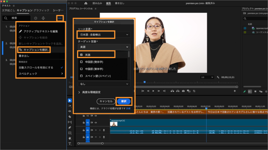Premiere Proに「キャプションを翻訳」機能が搭載され、音声から文字を起こし、キャプションを作成し、さらに他言語に展開するまでの一連の作業をPremiere Pro上でスムーズにおこなうことができます。このチュートリアルでは、日本語のキャプションを英語に、英語のキャプションを日本に翻訳する工程を解説します。まずは下の動画で一連の制作工程を確認してください。