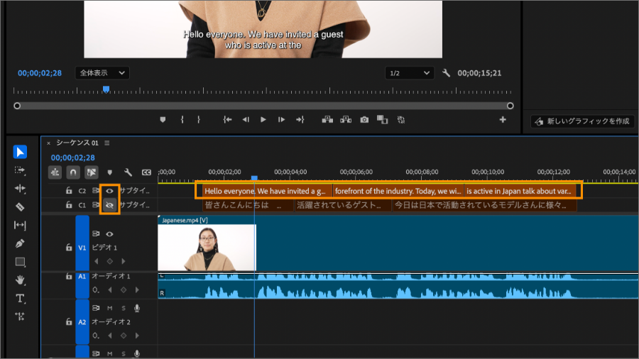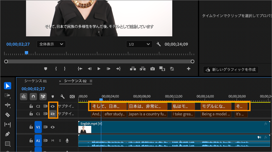 タイムラインで、新たに追加されたキャプショントラック(英語)を表示、元のキャプショントラック(日本語)を非表示にして結果を確認します。