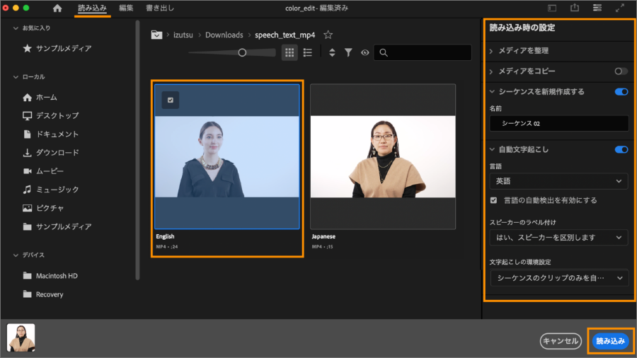 「読み込み」ワークスペースで、ダウンロードしたサンプルファイルの「Japanese.mp4」を選択し、「読み込み時の設定」を以下のように設定して、「読み込み」をクリックします。